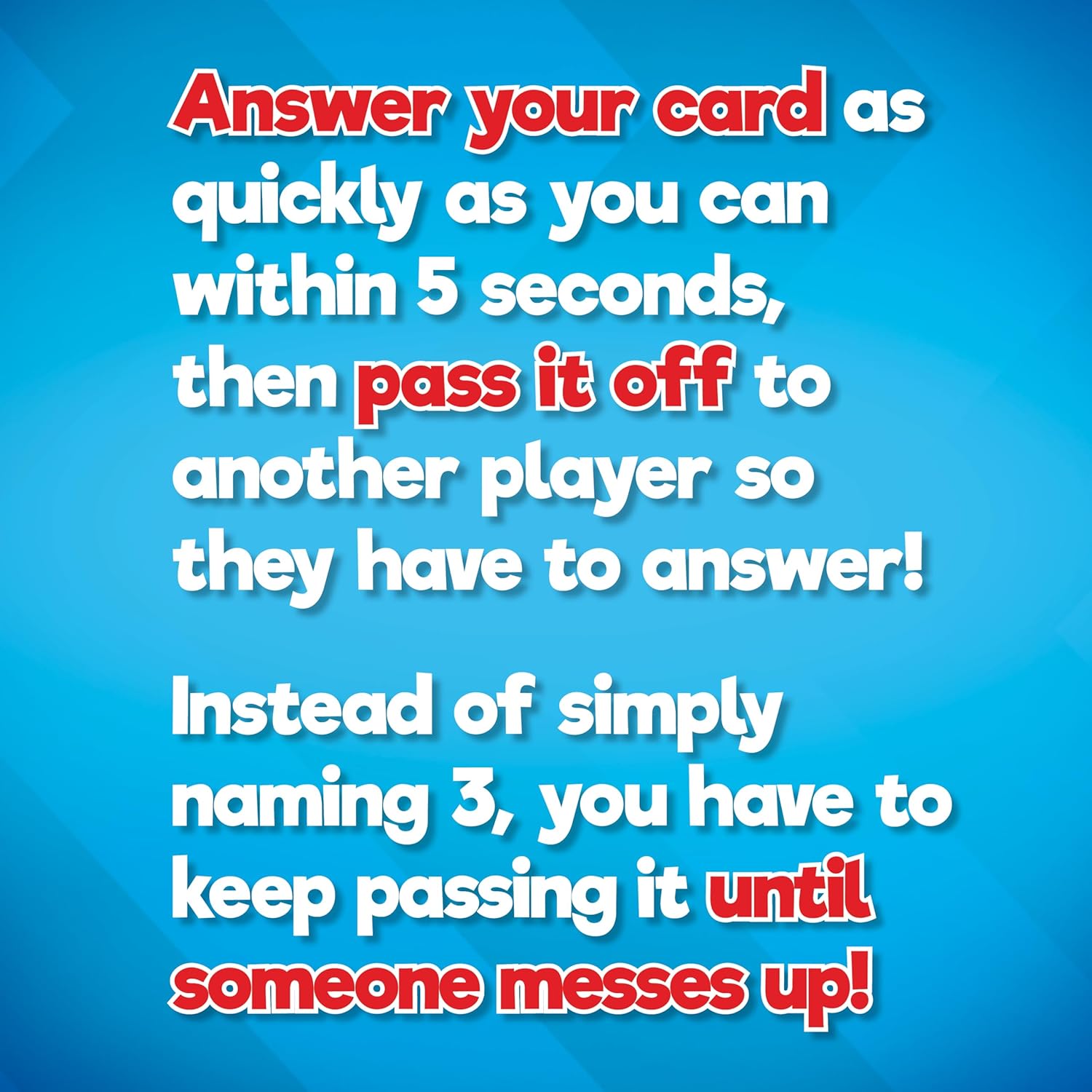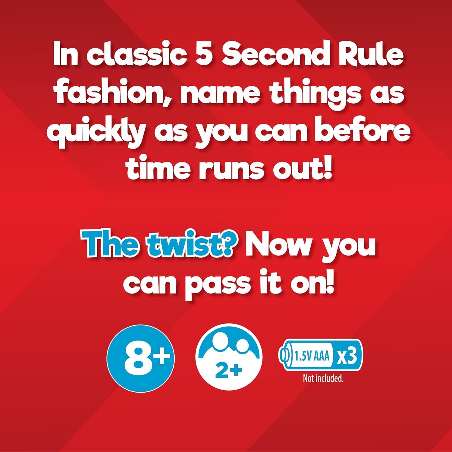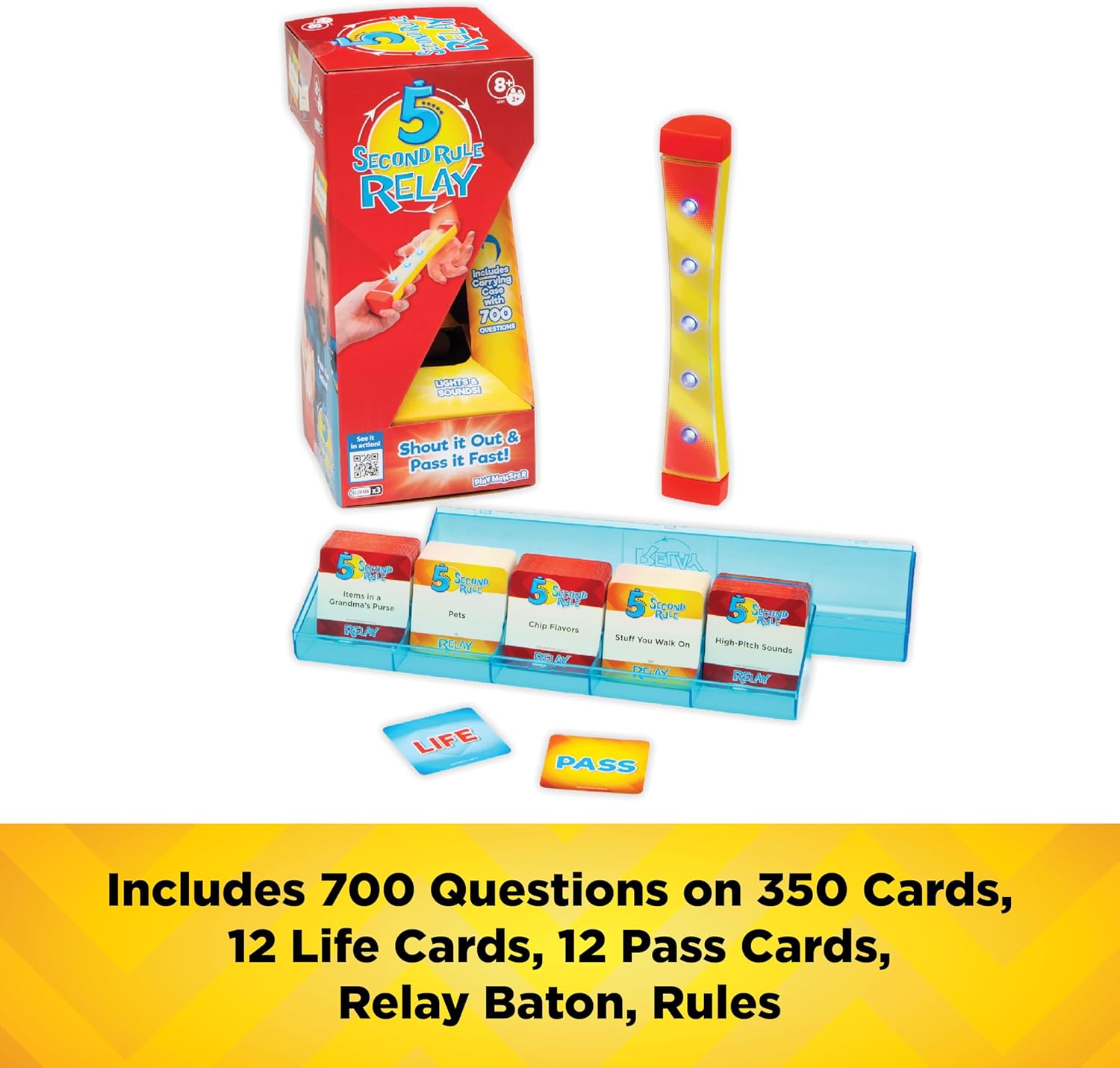 It should be easy to name pizza toppings-but can you do it under the pressure of 5 seconds counting down, after another player puts you on the spot? List one thing in your category, then hand off the electronic baton to any other player-you decide who has to answer next! Time’s not on your side, so just say what comes to mind and risk ridiculous answers slipping out! For 2 or more players, ages 8 and up. Comes with 700 Questions on 350 Cards, 12 Life Cards, 12 Pass Cards, Relay Baton, and Rules.