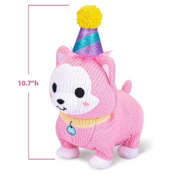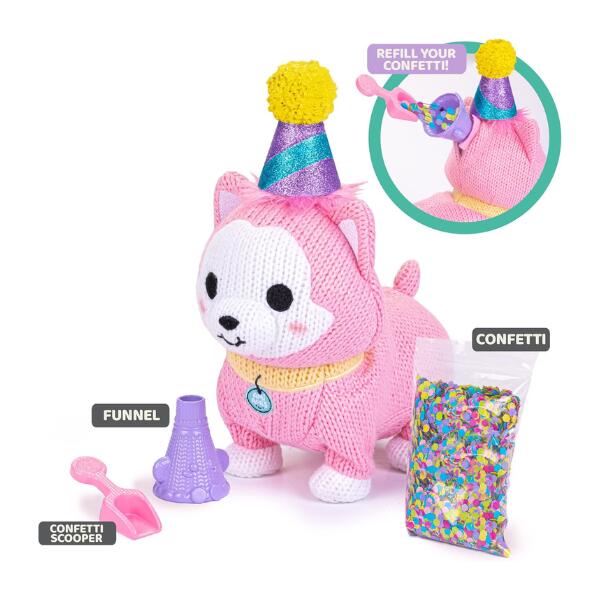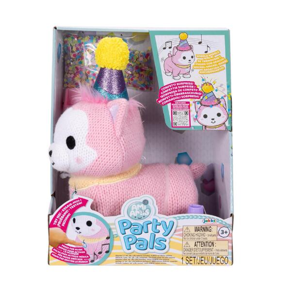 AMI AMIS PARTY PAL is the Ultimate Festive Fun Plush Toy for every day or a celebration. Features our signature Ami Amis chunky knit style. The pink Party Pal dog really moves with a wiggle walk. Plays fun music and horn. Get ready for an explosive confetti surprise. Comes with scoop funnel, and extra confetti to load and clean up.