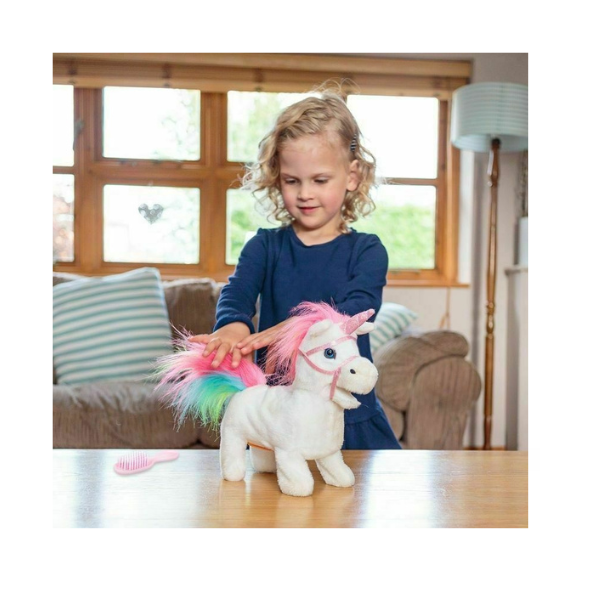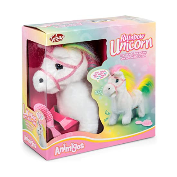 Introducing the Animigos Rainbow Unicorn. The Tobar Animigos Rainbow Unicorn is a plush unicorn-toy with fully animated features and a beautiful rainbow-mane. When activated, the unicorn trots forward, making the occasional magical twinkling sound. This animated plush-toy makes an enticing display-piece that is sure to draw attention! Part of the Animigos range. This bright beauitful unicorn trots, neighs you little one can also brush its lovely colourful mane and tail. This rainbow unicorn will make an ideal gift for any child and is sure to provide hours of fun and also entertainment.