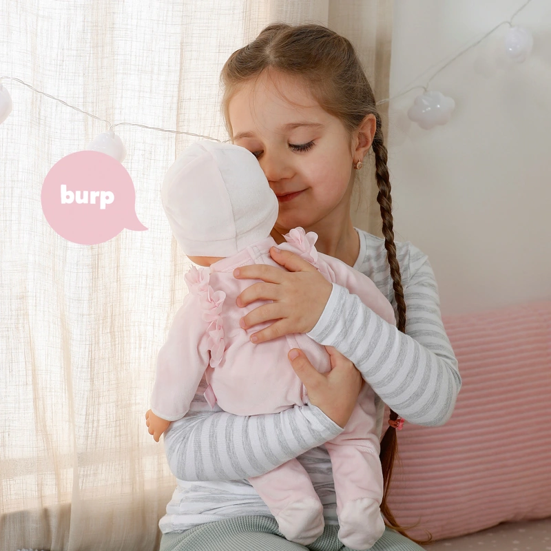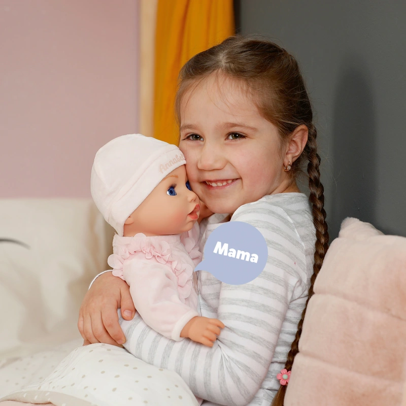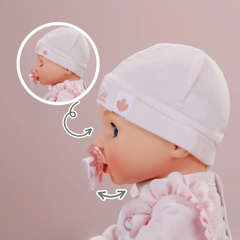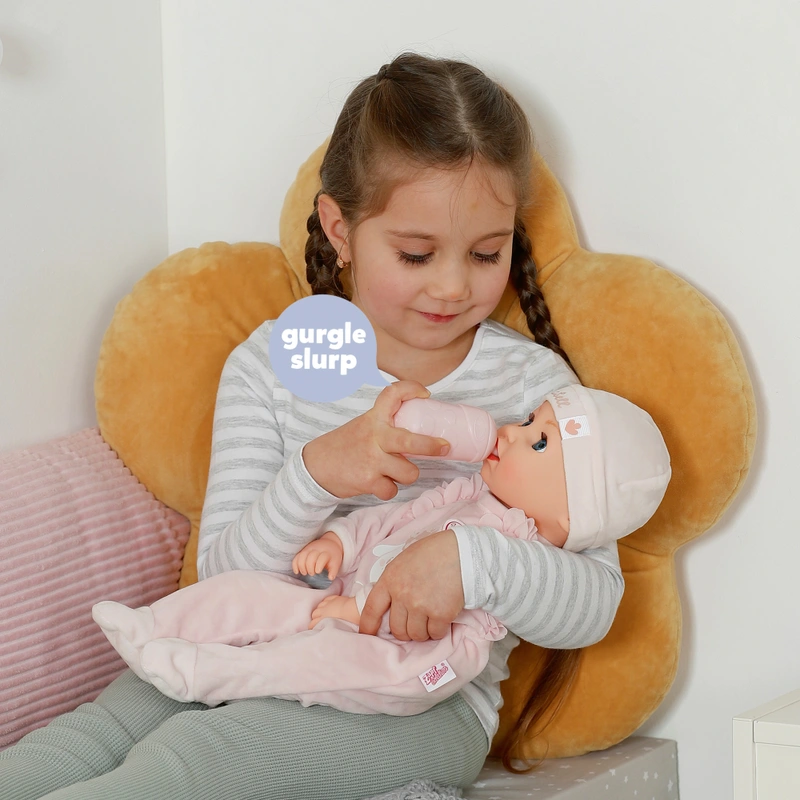 Baby Annabell can make crying noises when upset, but a cuddle or a tickle will make her giggle again. Her mouth will move when drinking or sucking her dummy and her eyes gently close when you rock him to sleep. She will even make a baby pop sound when she has wind! For more play opportunities, lift her legs over her tummy, towards her head, to initiate baby gym mode and she will make more giggling and baby talk sounds!