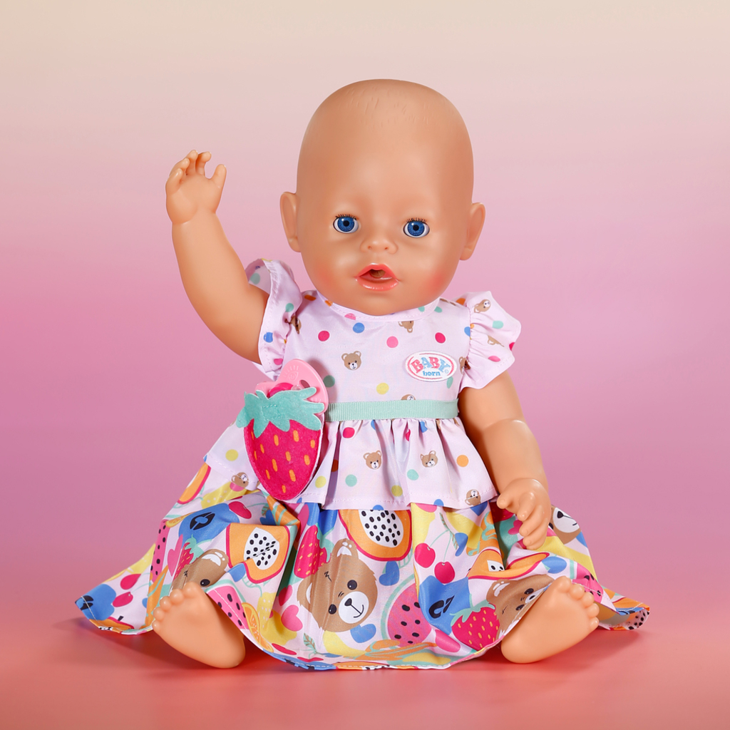 Introducing the Baby Born Dress Fruit 43cm . Oranges, melons, strawberries – how many fruits can you count on the colorful dress? This fun and colourful dress has cute frill details to the sleeves and a strawberry buckle belt.