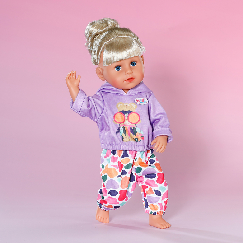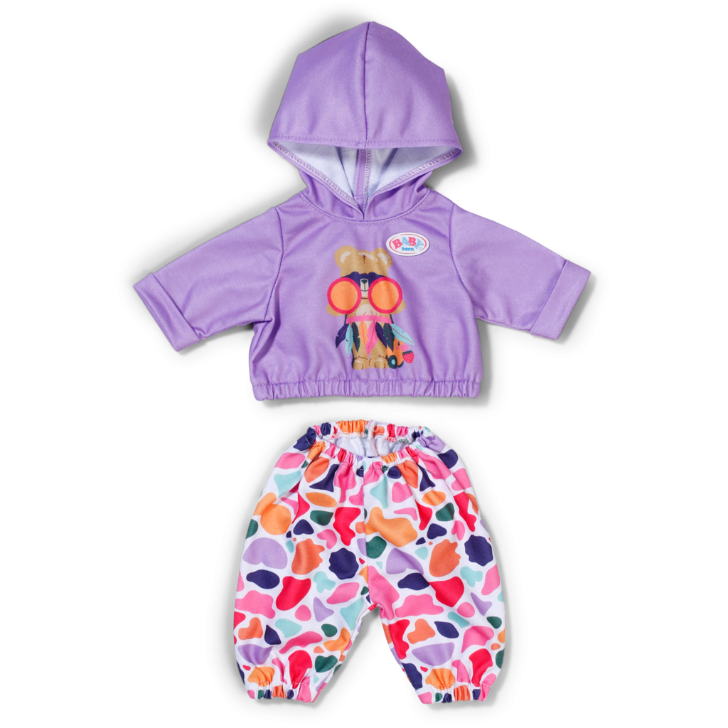 Introducing the Baby Born Hoodie Outfit 43cm. Casual yet colourful and comfortable: 2 piece set of purple hoodie sweater with teddy print and colourful trousers.For 43cm dolls. Please note Doll is not included.