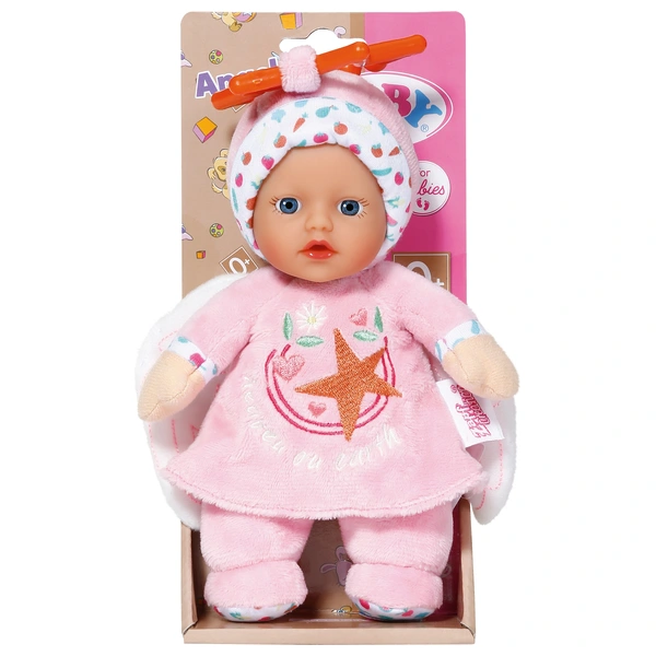 Introducing the Baby Born Pink Angel Doll 18cm. With their adorable faces and pretty wings, Baby Born Angel for Babies are the sweetest little dolls, designed especially for babies. Both have lovely decorative graphics on the front and angel wings on their backs. Their super-soft bodies are great for cuddles and the star attachment means they can be used both in the cot or travel with their little friend by attaching to the pushchair and used for entertainment. Each sold separate. One doll supplied. Suitable from birth.