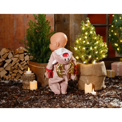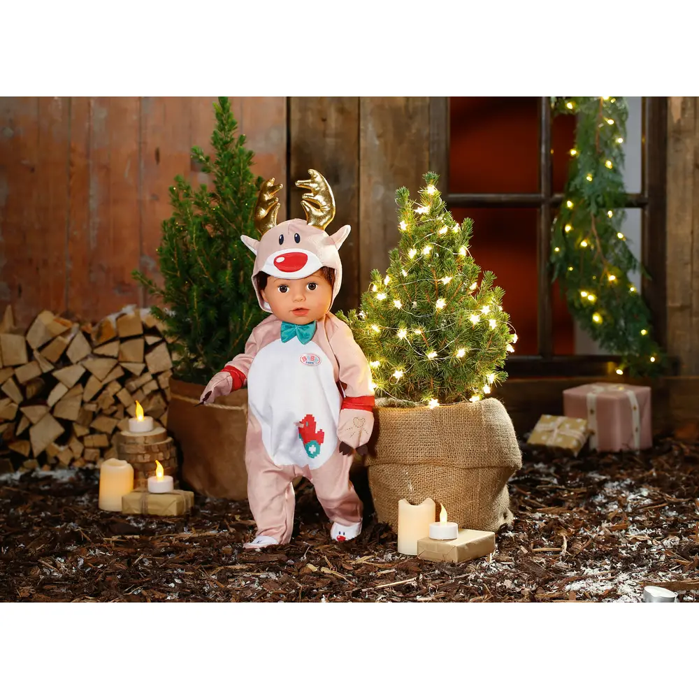 Introducing the Baby Born Reindeer Onesie. An adorable x-mas outfit for Baby born. This reindeer onesie will keep Baby born comfy this Christmas while the attached mittens will keep her hands nice and toasty. For small hands. Made in an easy fit style so even the smallest children can effortlessly put it on and take it off. Includes a cuddly brown onesie made from the softest material decorated with a tail, a bowtie, a red nose, and gold sparkling horns, attached little mittens, and a clothes hanger. To fit dolls up to 43cm (doll not included).