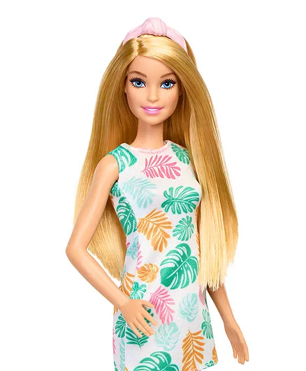 Barbie doll styles her long blond hair with a pink headband, and wears an adorable leaf-print dress with pink boots! She comes with a sweet pet kitten who loves to join in on the fun