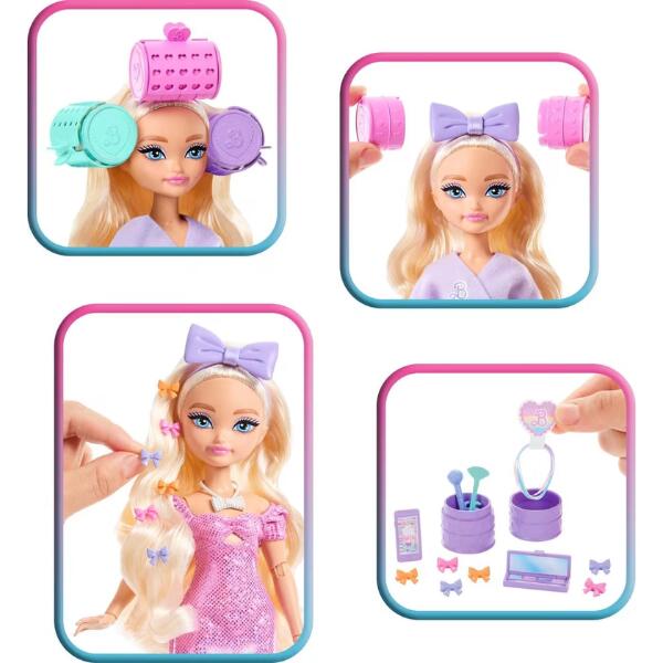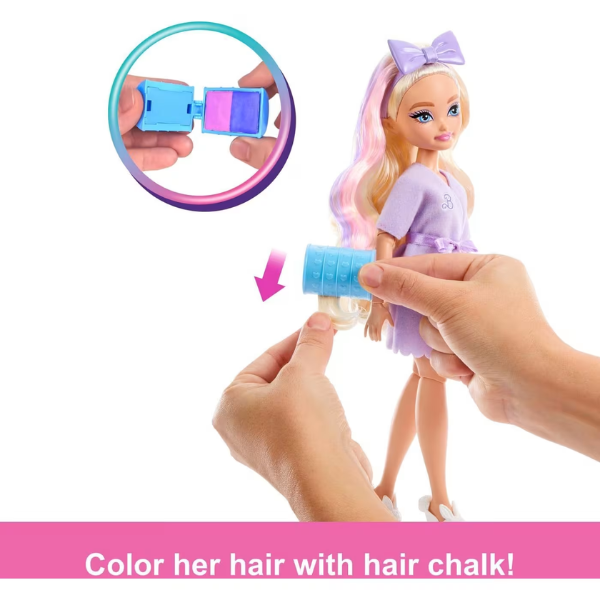 night out! Open her hair curlers to find fun surprises, like hair chalk and an oversized bow! Barbie can wear her robe while she’s styling her hair, then she can