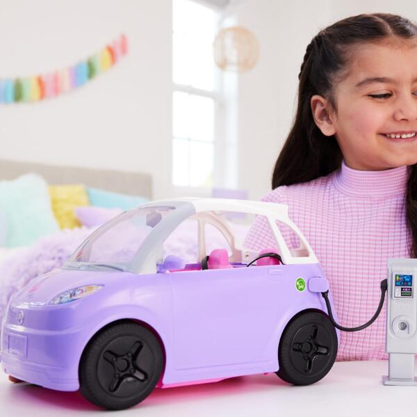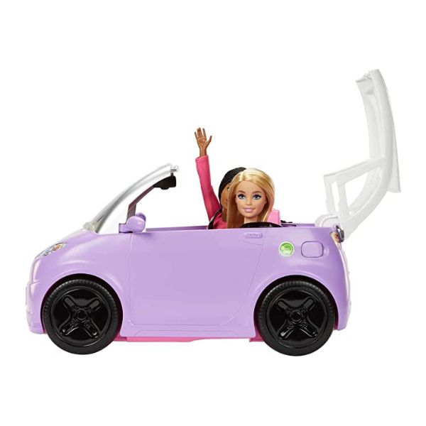 Barbie Electric Car. Let the good times roll with the Barbie “electric vehicle”! Not only do the wheels really roll for driving play, but it is also cute as can be with a sunroof and purple coat. From cruising with some good tunes to going on an epic road trip, kids can take Barbie on so many fun adventures with this car that seats two dolls! Dolls not included. ​Buckle up and zoom away! The top opens to transform the vehicle into a stylish convertible, perfect for beautiful days.