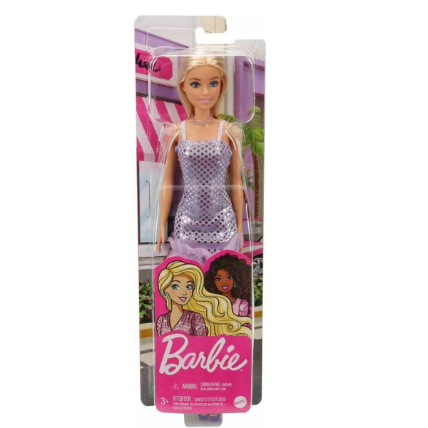 Barbie Glitz Doll Mini Dress Blond. Stars dazzle in the night sky, and Barbie dazzles in her sequined look! These Barbie dolls capture the ultimate in modern style with trendy mini dresses and accessories. Completely embellished with metallic detail, Barbie doll’s lavender dress is perfect for any nighttime soiree! A fitted silhouette and sheer ruffle hem add an extra note of pizzazz. Her dress comes with a matching choker necklace and slender heels, rounding out the ensemble for any party or special event!