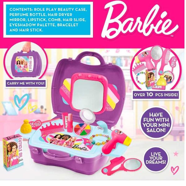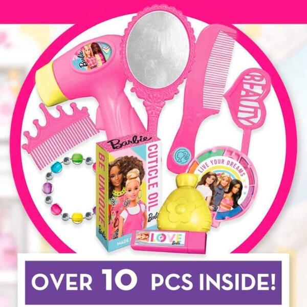 Create endless glamorous hairstyles for you and your Barbie doll. This Barbie hair and beauty set is stored in this handy travel case. The perfect set for you and your Barbie to have fun on the go. The set includes the hair and beauty case, perfume bottle, hairdryer, mirror, lipstick, comb, hair slide, eyeshadow palette, bracelet and hair stick. Perfect for a glamorous day at the salon, there’s no end to the fun.