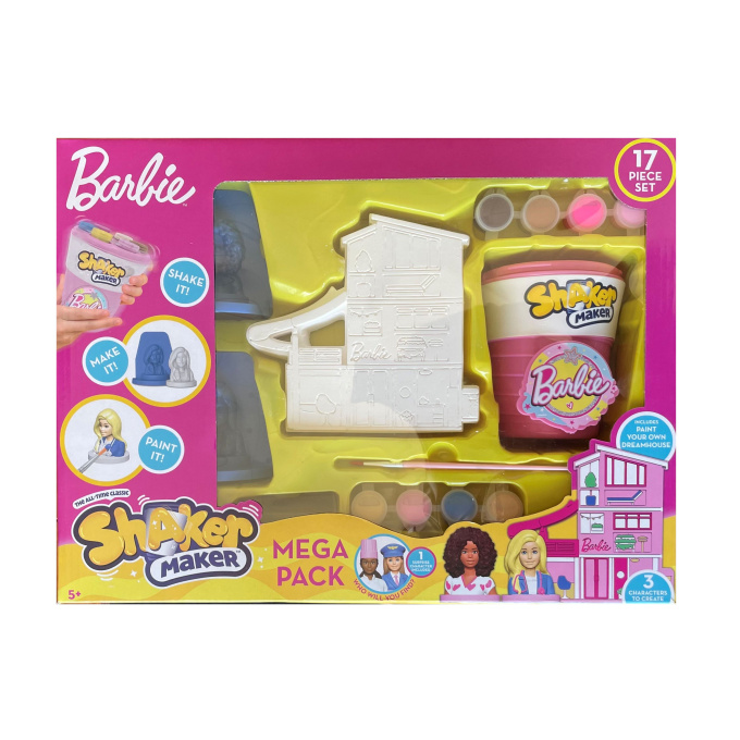 Just shake it to make it with this Barbie Shaker Maker Craft mega pack. Fill the specially designed mould with Shaker Maker powder and shake and shake to magically create fabulous models. Decorate your models with the brightly coloured paints provided, includes Barbie’ s dreamhouse to paint in style! Fill the specially designed mould with Shaker Maker powder and shake Create great Barbie models ready for you to paint with the included paints Contents:1x shaker maker, 250g shaker maker powder, 1x paint your own Dream house, 3x character moulds, 8x paint pots, 1x paint brush, 1x mixing beaker,1 x wooden stirrer Suitable for age 5 years plus. Shop our full  range of Barbie