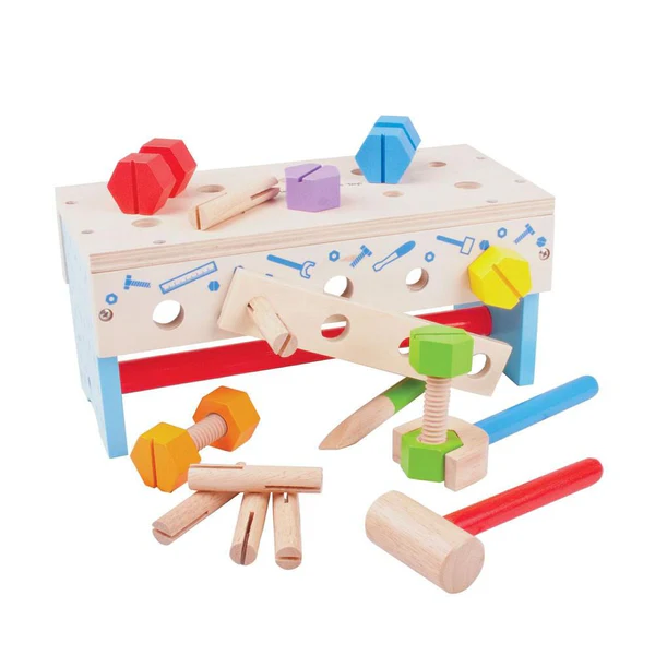 This cleverly designed wooden Carpenters Workbench includes a wooden spanner, file and hammer and lots of nuts and bolts. When it’s time to pack up, everything can be stored away neatly by turning the bench upside down and placing all of the items inside. Includes a built in carry handle, so this wooden toy can travel with your little one! Made from high quality, responsibly sourced materials. Conforms to current European safety standards. Consists of 18 play pieces.