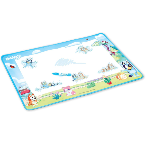 • Introducing the Bluey Aquamagic Art Mat. This large mat measures 70 x 54cm and also features super cute and colourful Bluey designs around the edge. Simply fill the special sponge pen (included) with water from the tap and wipe it over the surface of the mat to reveal fun Bluey designs!