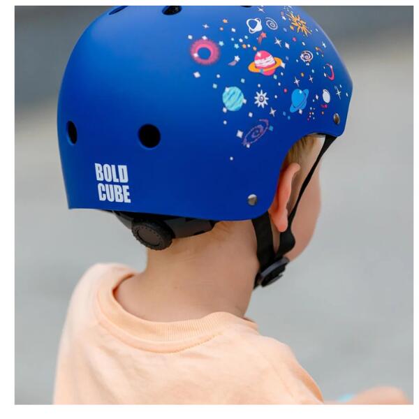 Introducing the BOLDCUBE Blue Kids Helmet – Small . The most important protection for your child is a suitable and certified helmet. The scooter helmet from Boldcube not only looks stylish, it also offers optimal protection. Of course, the helmet can also be used for cycling , skateboarding , and other activities where head protection is important. The outer shell of the helmet is made of impact-resistant and shock-absorbing materials. Underneath is breathable EPS foam padding with 11 cooling air vents for additional comfort. The chin strap is adjustable and has an adjustment dial for a firm but comfortable fit.