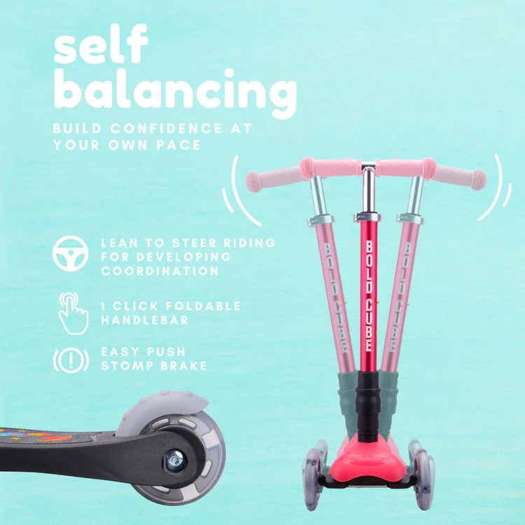 Introducing the BOLDCUBE Ocean Teeny Fold 3 Wheel Scooter. BOLDCUBE’s Teeny FOLD Scooter is the perfect entry level kids tri scooter for little children aged 3 – 9 years old. Engineered with a Lean to Steer / Tilt to Turn steering system and it is also completely self balancing. It’s the ideal first scooter for toddlers & little kids developing balance and also confidence to take the pavements!