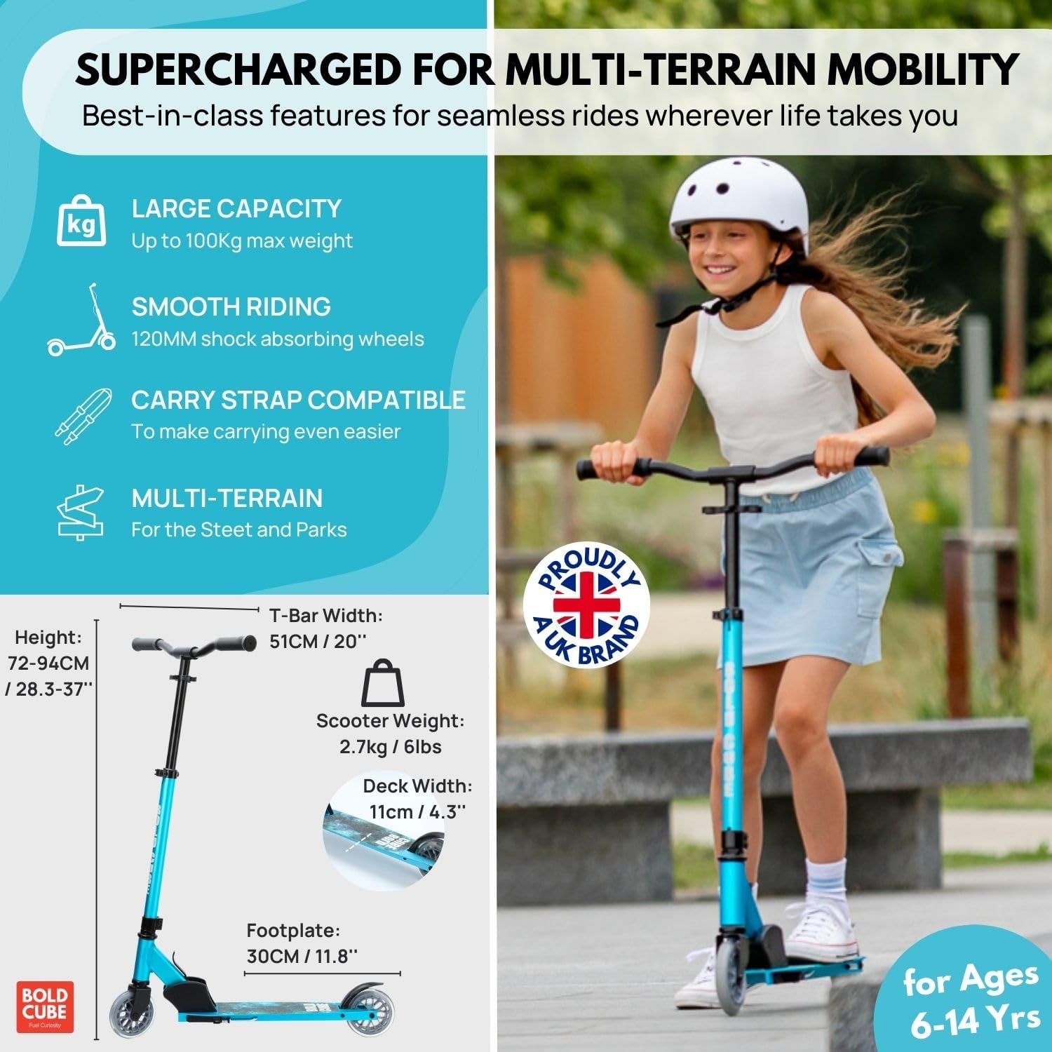 Introducing the BOLDCUBE Turquoise Deluxe 2 Wheel Scooter. Suitable scooter for boys and girls age 6-12 years. With an adjustable handlebar from 72 – 94cm / 28.3 – 37″. Weighing up to 100kg / 220lbs that are looking for a durable & also lasting 2 wheel kids scooter. For maximum comfort and precision, young riders will also benefit from wide chopper bars that are ergonomically designed for school run commutes and long park journeys. The extra width allows riders to easily turn their 2 wheeled scooter without feeling like they’re losing balance. Ideal choice if your kids is transitioning from scooter with a self balancing 3 wheel kick scooter.