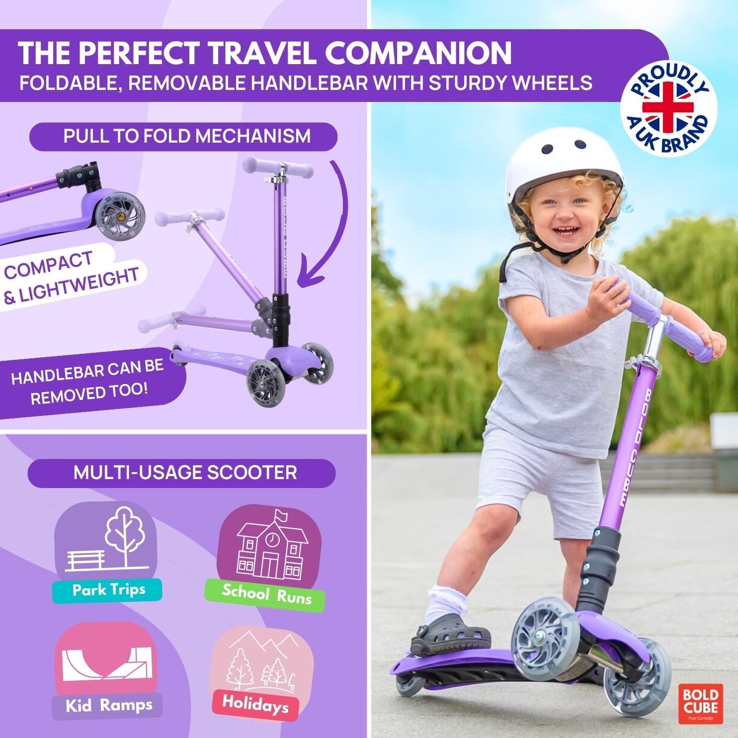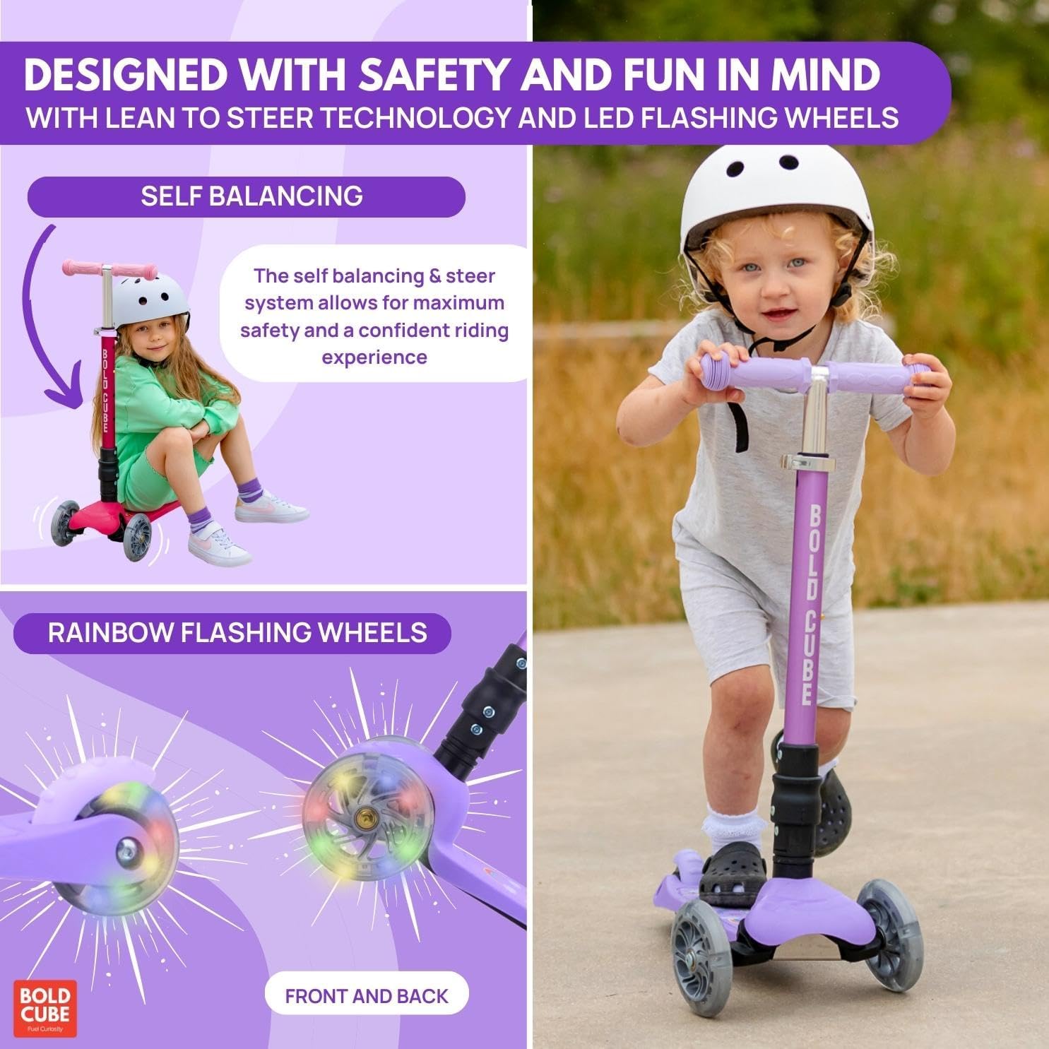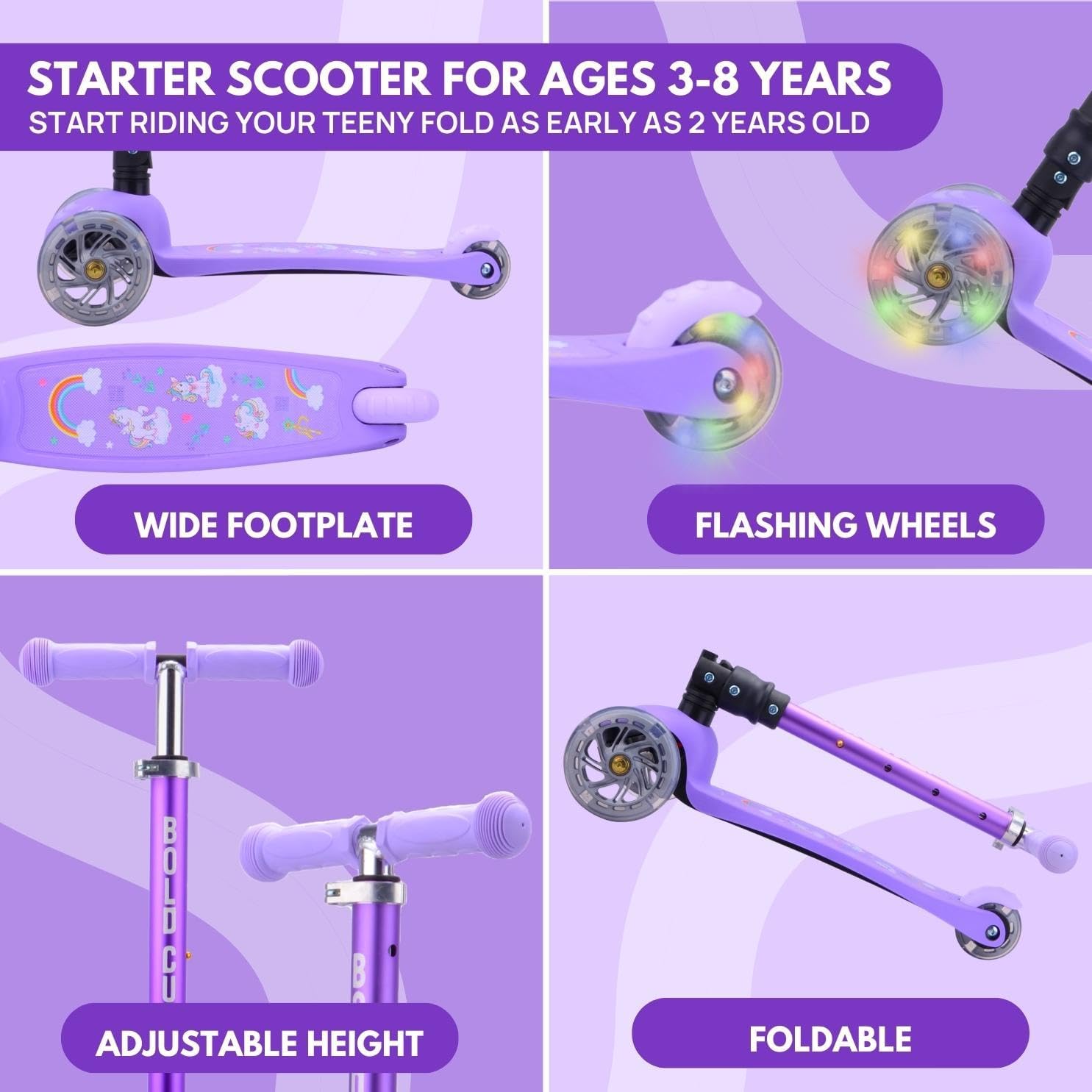 Introducing the BOLDCUBE Unicorn Teeny Fold 3 Wheel Scooter. BOLDCUBE’s Teeny FOLD Scooter is the perfect entry level kids tri scooter for little children aged 3 – 9 years old. Engineered with a Lean to Steer / Tilt to Turn steering system and it is also completely self balancing. It’s the ideal first scooter for toddlers & little kids developing balance and also confidence to take the pavements!