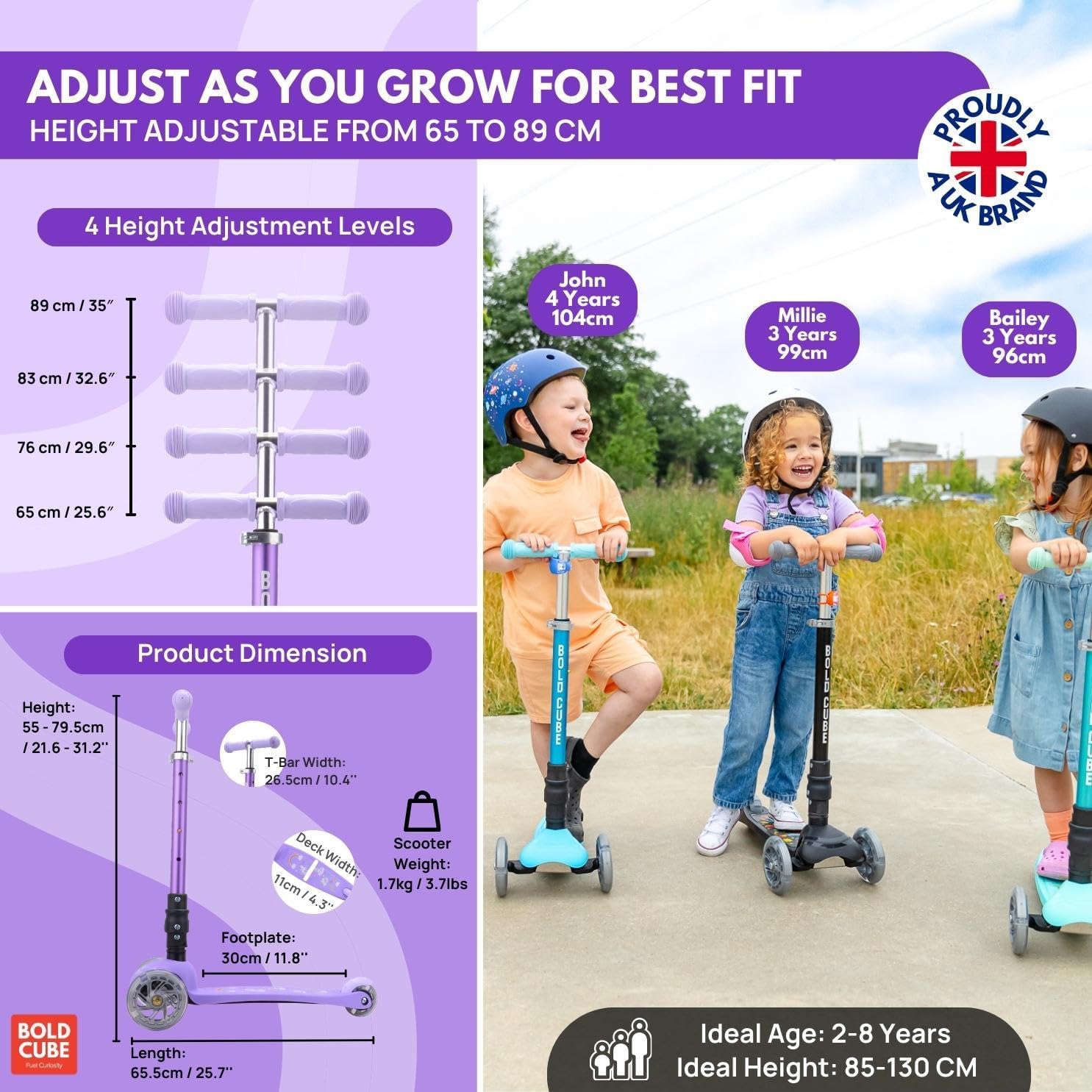 Once your little kid is tired of riding, the FOLDABLE scooter can be folded to store, pulled in a trolley style on their way home or by helping them along with a 3 wheeled scooter pulley strap. The height adjustable handlebar of this children’s scooter extends from 61-79cm / 24 – 31″. And is fitted with 4 predetermined height buttons, to make height adjustment as simple as possible for a young rider. We typically suggest the child’s height to range between 85cm – 130cm / 2.7ft – 4.7 ft. Suitable for children aged 3-9 years.