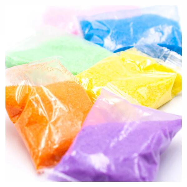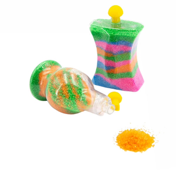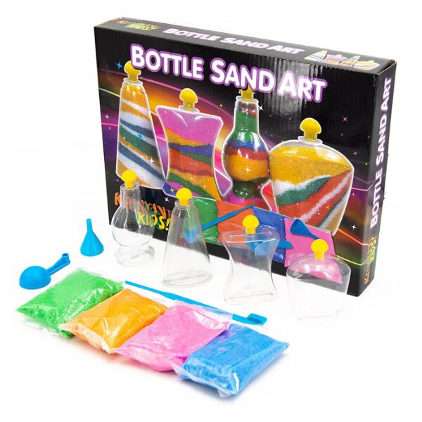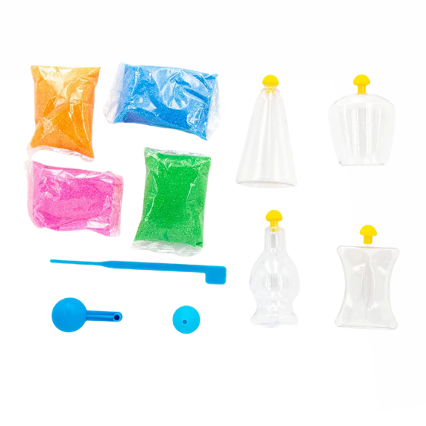 The sand art kit featuring: 4 bags of colourful sand; 4 bottles; 4 bottle stoppers. 1 funnel, 1 spoon and also tools needed to make super cool layers and swirls!
