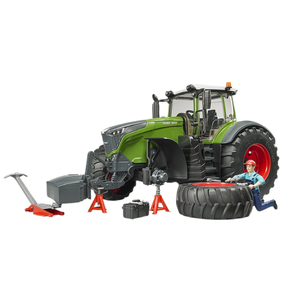 The Bruder 1:16 Fendt 1050 Vario with Mechanic top-of-the-range product model. This tractor really owns up to attributes, such as big, strong and unique! Its design, handling and traction force are unique. The model also features established characteristics, such as the steered front axle or the height-adjustable rear coupling to attach any Professional series trailer. There are also some new functions, such as the re-designed front mount to attach accessories and the special highlight, re-developed axles with detachable wheels. This set is suitable for all small farmers who frequently transport and load bales of straw, hay or silage.