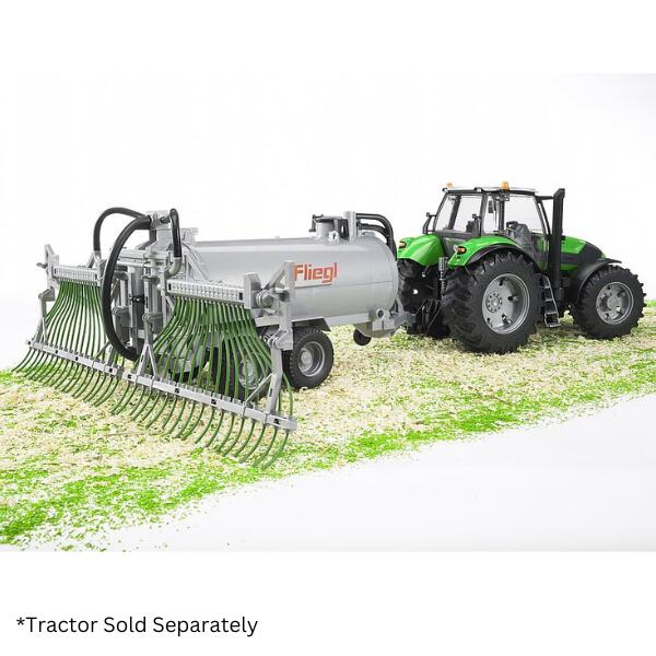 Bruder 1:16 Fliegl Barrel Trailer with Spread Tubes. The barrel trailer with spread tubes from Fliegl can also be filled with water and closed with a lid. The barrel trailer can be emptied again through the discharge valve. The spread tubes can be folded in during drive mode. The barrel trailer with spread tubes is suitable for all tractors of the Profi series (not included).