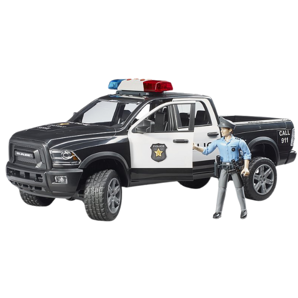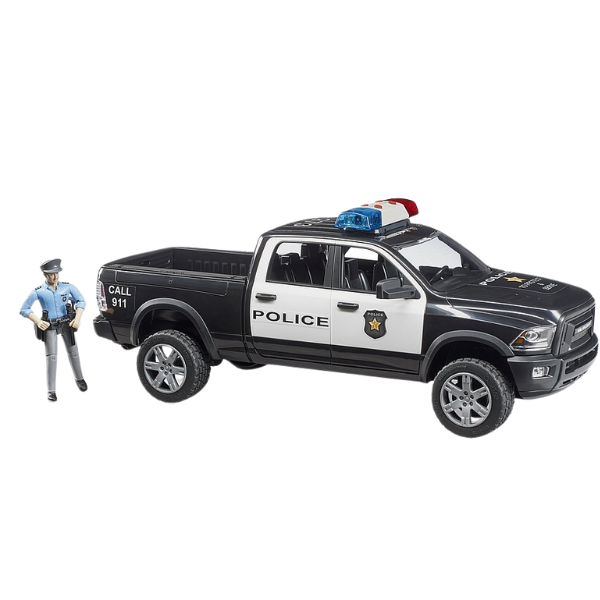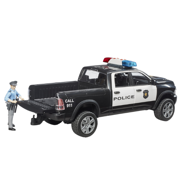 Bruder 1:16 Ram 2500 Police Pick Up with Police Officer. RAM 2500 pick up police truck with opening cab doors, front suspension axle, opening tailgate, removable front drawbar coupling, rear hitch, rolling wheels with profiled tyres. Front wheel steering controlled by steering wheel, with additional steering wheel extension rod, police lights and sound module included.