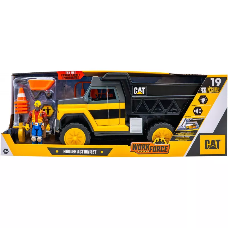 Introducing the CAT Workforce Hauler 32cm. Step into the world of real construction with the Cat Workforce playsets. Load up and haul heavy-duty cargo with the Cat Workforce Hauler Action Set! This 18+ piece set features a freewheeling hauler truck designed for big construction jobs. The articulated 4” figure fits inside the cab, and with lights, sounds, and action-activated sounds, the truck reacts to your play! Push it forward for engine revving sounds, pull it back for backup beeps and much more realistic sounds. Get ready for the most realistic hauling experience yet! Age 3+ years.