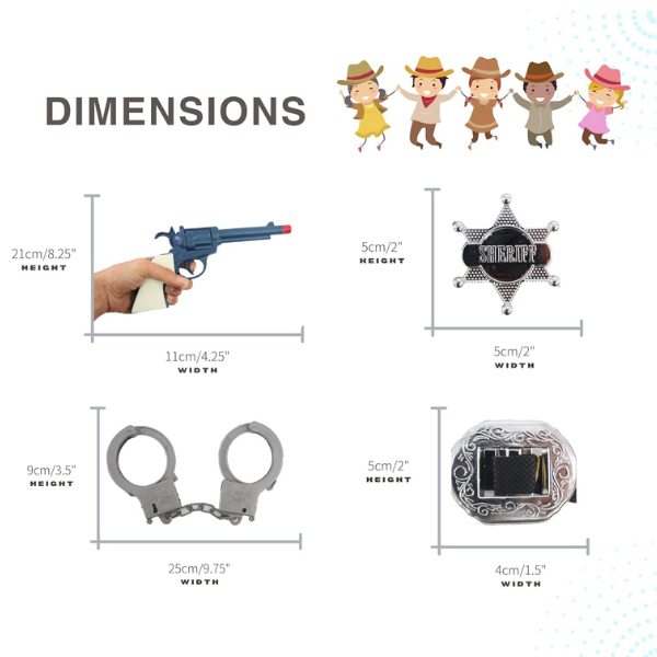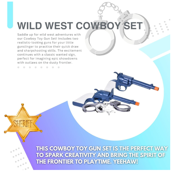 Hold on there Cowboy. This cowboy set includes two toy gun colts and ready for action to take down the outlaws. There’s a New Sheriff In Town and I have a badge to prove it! The shinny silver effect sheriff badge will let all the bad guys know who runs this town!