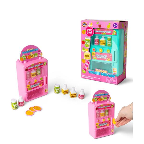 A working pretend and play vending machine, including 6 pretend dinky drinks and coins, to vend over and over again! Insert your coin, press the button for your favorite dinky drink and collect!