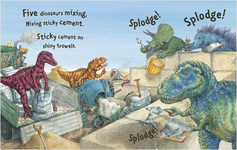• One dinosaur, who is digging a very big hole is joined by more and more dinosaur friends as they work on a huge construction project.
