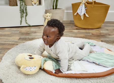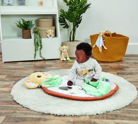 Introducing the Disney Baby Lion King Sensory Playmat. Playtime with Simba! Made from super soft plush and full of fun colours, sounds and textures for little ones to discover, the Disney Baby Lion King Sensory Playmat encourages tactile exploration and early development through play. Play peek-a-boo with the loveable lion cub Simba, lift the flap to reveal a baby-safe sun mirror, and try not to wake Simba and Nala as they snooze peacefully under the crinkle-sound leaf! Hand washable and easy to roll up and put away, this playmat is suitable from birth, and provides a soft, cushioned space for babies to start to explore their senses. Suitable from birth.