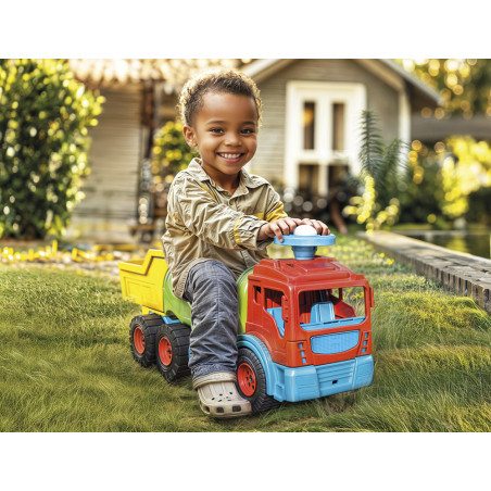 Introducing the Dolu Ride on Tipper Truck. The ride-on car has a comfortable seat and a practical steering wheel with a horn. Just like a real dump truck, the box on the back of the walker can be lifted to unload the load! The container can also be locked. It is suitable for children from 2 years old and is made of robust plastic, so it can be used both indoors and outdoors!