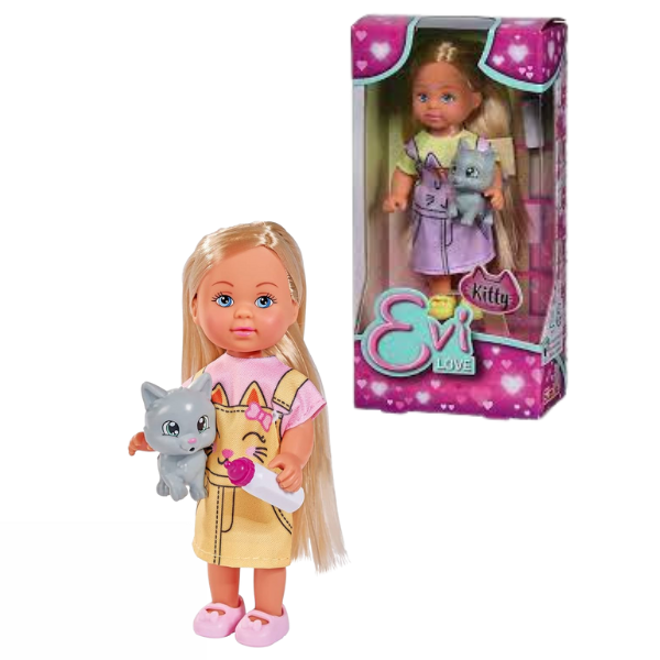 Evi Love is Steffi Love’s little sister. Just Like Steffi, Evi has beautiful long hair, countless hobbies, loves animals and is always perfectly dressed for every occasion. Children will love storytelling with this Kitty Playset from the Evi Love range. Evi is wearing a cute dress with a kitty motif. She has a cute kitten and also a bottle with which she can feed her kitten. Don’t forget to browse the rest of the Evi Love range, where you’ll find plenty more dolls, playsets and accessories to inspire their imaginations (each sold separately). Colours and styles may vary