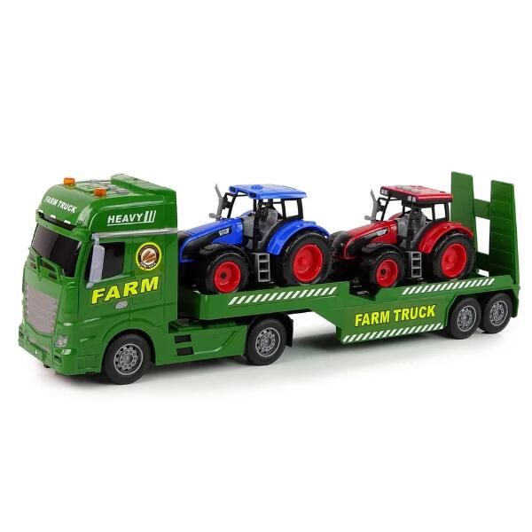 Introducing the Farm Truck 53cm with Lights & Sound. The Farm Tractor Transporter with Sound & Lights 1:12 scale playset is the perfect choice for young farming fans. This exciting set includes a green transporter truck and two tractors in red and blue, complete with light and sound features. The drop-down ramp makes loading and unloading easy, while the tractors add even more fun with front lights and realistic sound effects. Rubber tyres and tinted windows enhance the look, and the durable plastic construction ensures safe and lightweight play. With its interactive features, this set provides endless farmyard adventures indoors or outdoors. Suitable for kids aged 3 years and over.