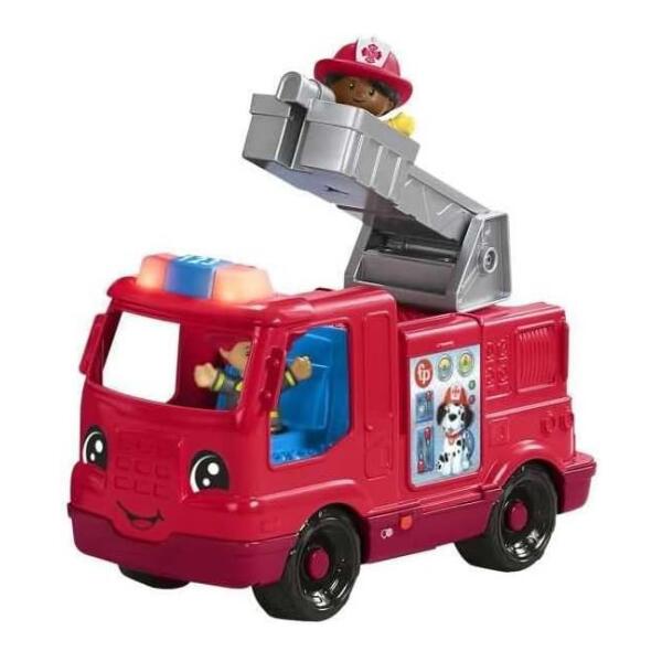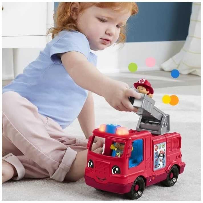 Toddlers can invent their own fun inserts with this Little People toy fire engine from Fisher-Price This push toy car with music is equipped with fun lights, realistic sounds, songs and phrases to sing along as well as a ladder that children can lift and turn. The fire engine includes 2 firefighter figures that can sit in the car. One in the driver’s seat and one in the back of the vehicle, making even more fun stories possible. The globe button selects the desired language: English, German or French. (Colour and design may vary slightly.)