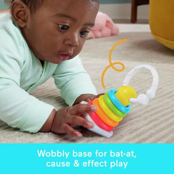 Inspired by the classic Fisher-Price Rock-a-Stack ring stacking toy, this wobbly drop-through activity toy introduces your baby to the fun of cause and effect! The Drop Through Rock-A-Stack comes with 5 colourful rings for little ones to slot through the top or side of the maze and watch as they roll down, around and out the bottom. For added cause & effect fun, the maze features a wibbly-wobbly base, just like the original Rock-a-Stack toy! Please note that colours and decorations may vary.
