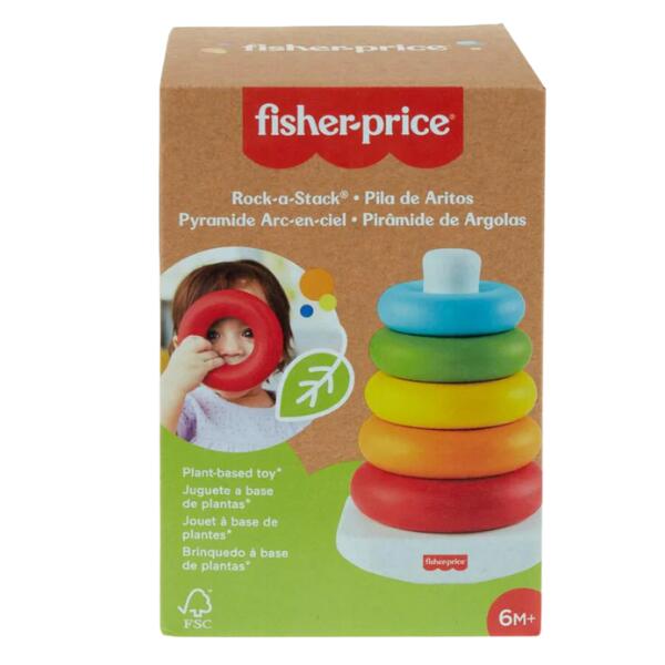 Fisher-Price Rock A Stack. At last…the ring to top them all. This Fisher-Price Rock-a-Stack toy, made from plant-based materials*, offers classic stacking fun for babies. It features a wibbly-wobby rocker base and 5 colourful rings for little hands to grasp and stack. Stacking helps baby develop hand-eye coordination and introduces them to the concept of relative size as they learn to sort and stack from biggest to smallest! (*Toy made from a minimum of 90% ethanol extracted from sugar cane.) For babies ages 6 months and older.