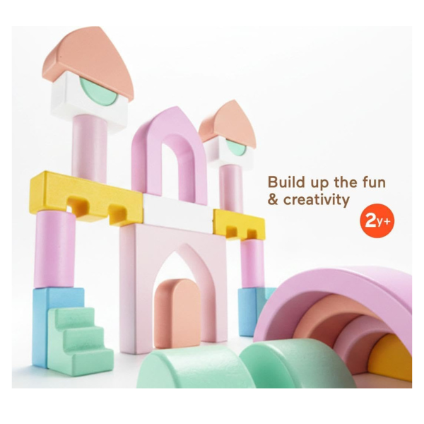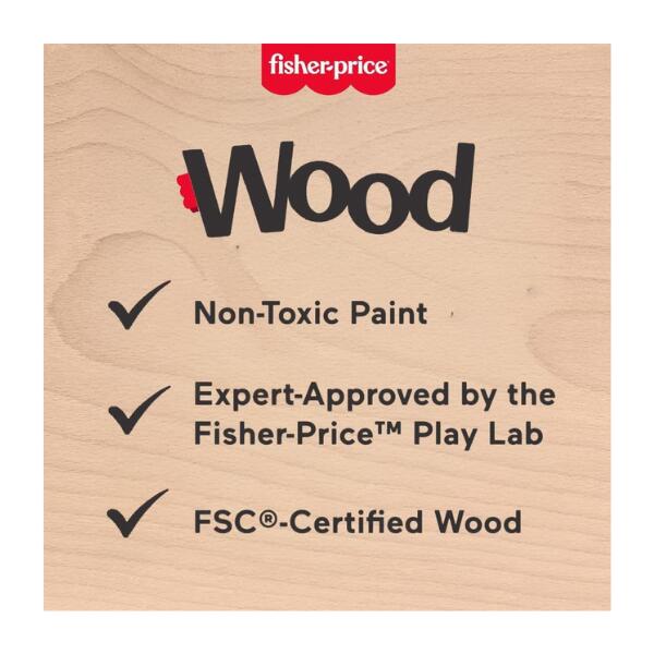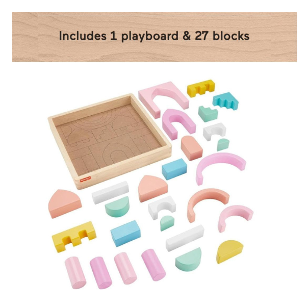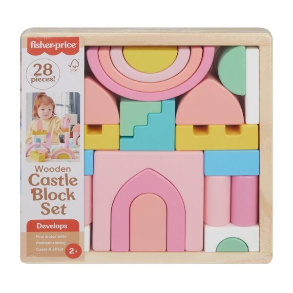 Toddlers and preschool kids will love building a castle, a house or anything they can imagine with the Wooden Castle Block Set from Fisher-Price. This stacking toy includes 27 pastel-colored wooden blocks that come with a handy playboard to help keep things organized. Made with wood from Forest Stewardship Council-certified sources (FSC-N004566) and decorated with non-toxic, water-based paints, this toy can help inspire creativity and introduce music to your child in a fun and exciting way! Colours and decorations may vary.