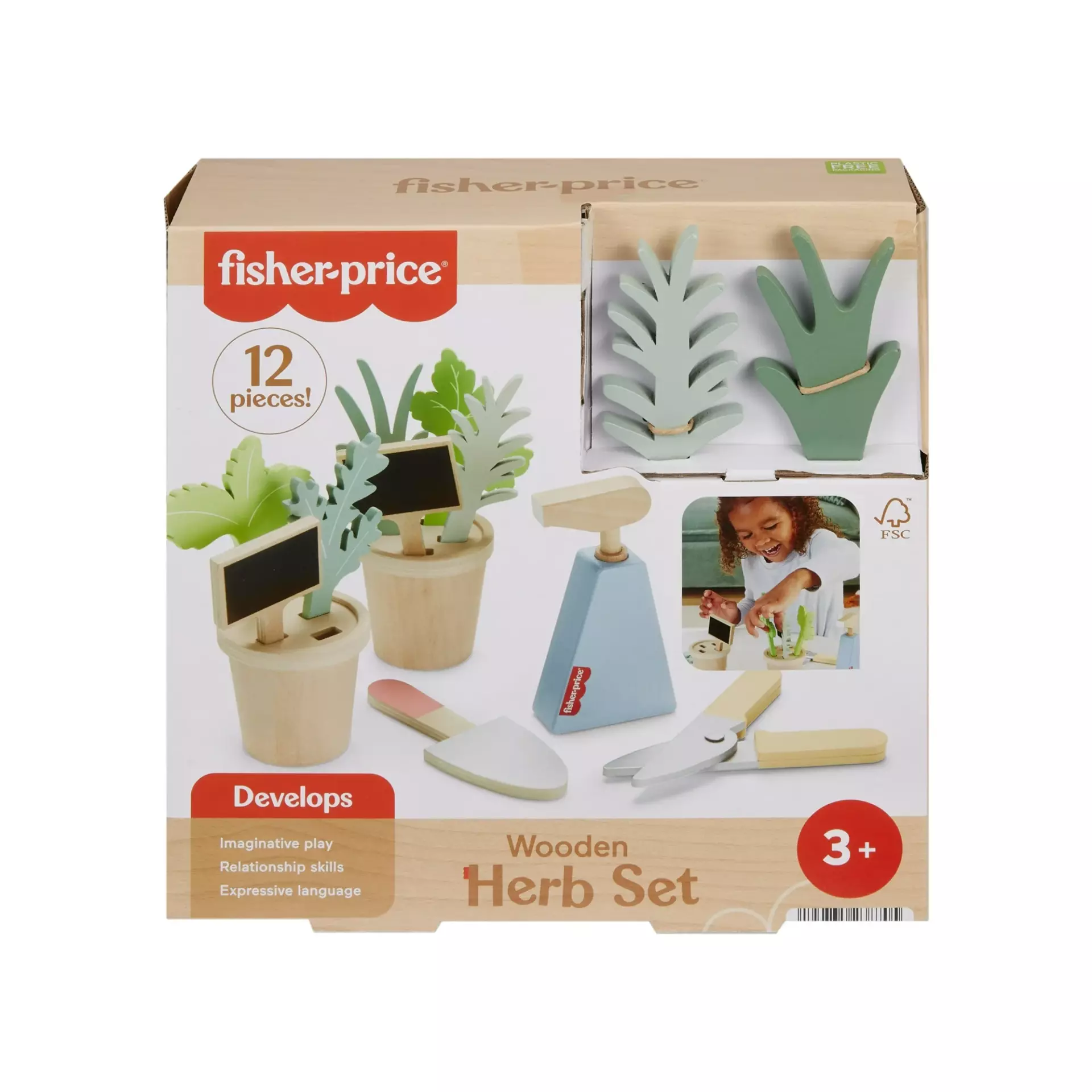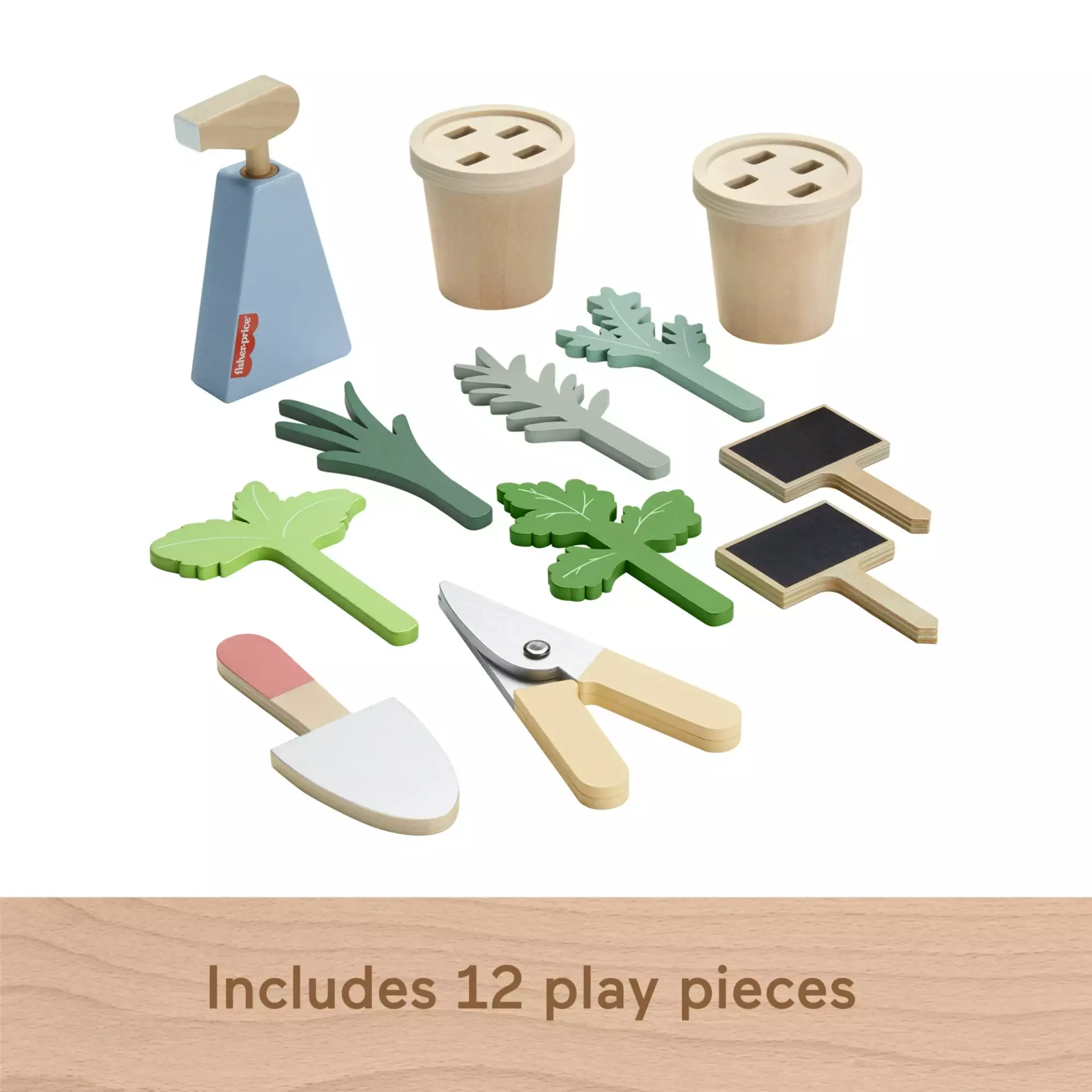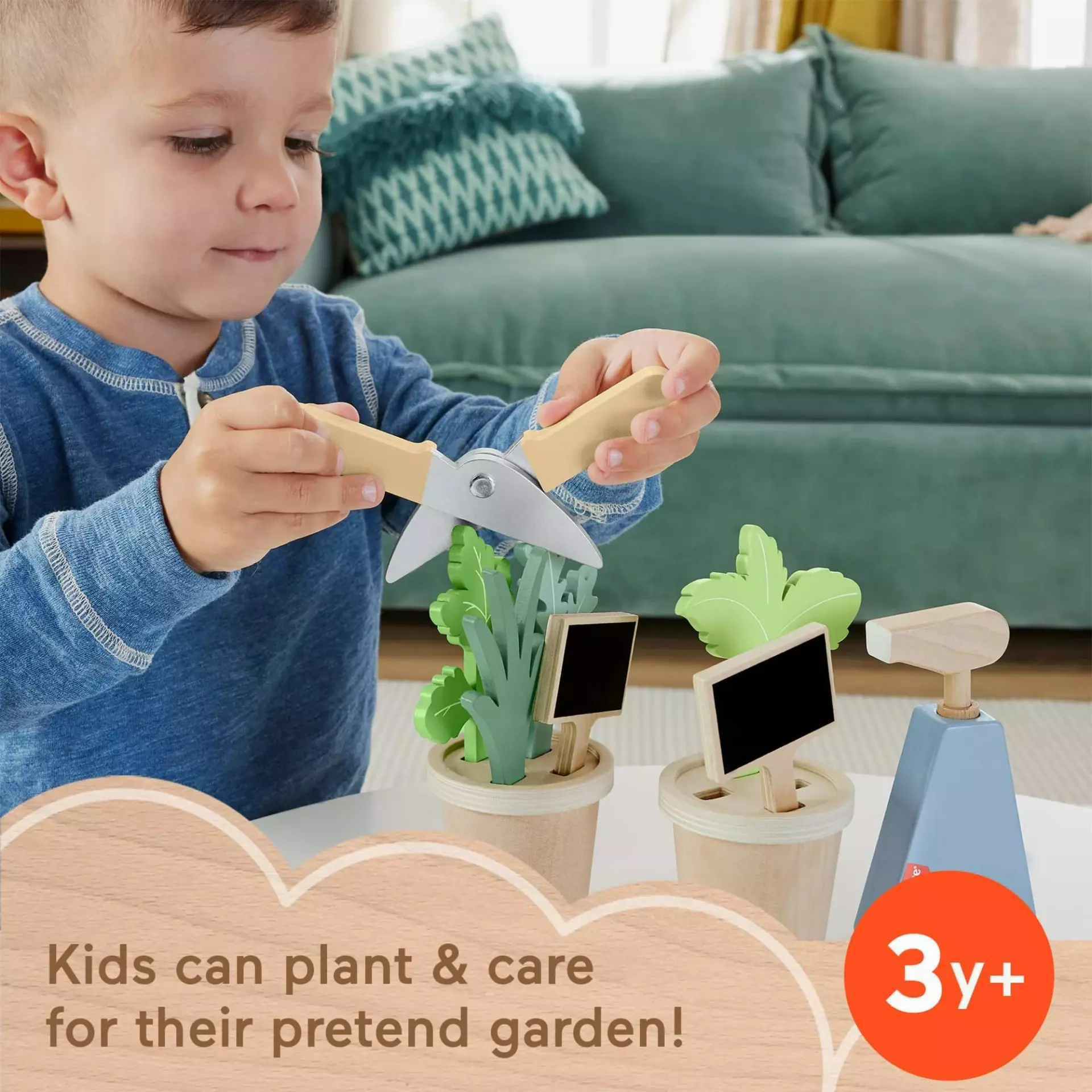 Preschool kids can plant, prune, and grow their own pretend herb garden with this wooden gardening role-play set from Fisher-Price. This 12-piece playset includes 2 plant pots with wooden leaves & plants, a pretend shovel, toy shears, a mister bottle, and 2 chalkboard signs so little gardeners can label their plants. Made with wood from Forest Stewardship Council-certified sources (FSC-N004566) and decorated with non-toxic, water-based paints, this adorable playset helps get preschooler’s creativity blossoming and blooming. (Chalk not included.) Colors and decorations may vary.