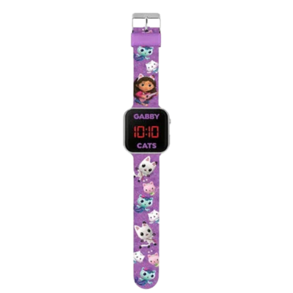 Introducing the Gabbys Dollhouse Digital LED Watch, This handy little digital watch includes a Gabby’s Dollhouse design dial, plastic casing, red digital display and a fun cats printed purple strap with traditional buckle fastening.