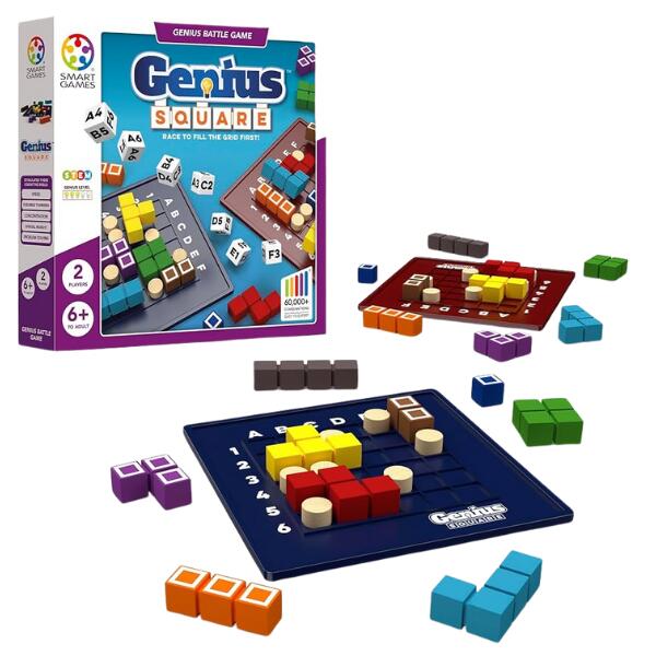 Introducing the Genius Square board game. Race and level up your puzzle skills! Think fast to solve the challenges before your competitor reaches the highest level. Roll the dice, place the 7 blockers on the game board accordingly and complete the square using the 9 puzzle pieces before your competitor. Finished first? Start the next game in a higher level and leave your competitor lagging! Be the first to solve all 5 levels. Includes more than 60,000 puzzles divided over 5 difficulty levels, all having at least 1 possible solution. Test your speed and ingenuity with this unique and fun game for 1 or 2 players.
