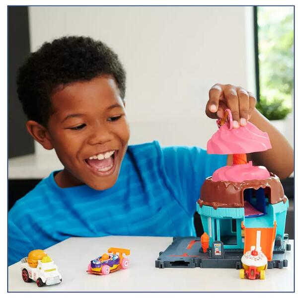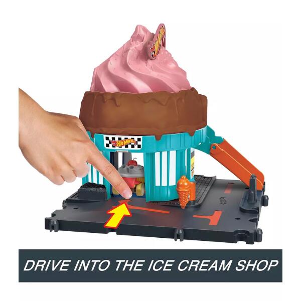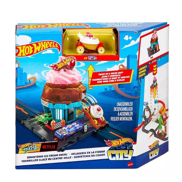 Introducing the Hot Wheels City Downtown Ice Cream Swirl Vehicle Playset. Get a giant scoop of awesome track play with the Hot Wheels City Downtown Ice Cream Swirl playset! The ice cream cone-shaped set features a kid-powered elevator that swirls cars up and through the ice cream and onto the fold-down ramp to more sweet adventures.