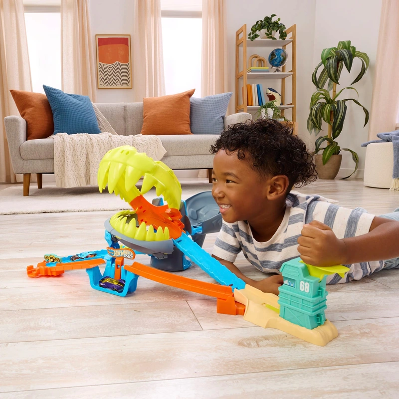 Kids and their Hot Wheels toy cars take on a hungry shark nemesis in the Hot Wheels City Shark Chomp Beach Playset. Adjust the pivoting launcher to take one of two paths: stunt over a gap jump to avoid the shark, or take direct aim at it with a full figure-8 stunt. The trick is to launch cars hard enough to escape unscathed and knock the shark out. With a simple reset, kids can take the challenge again.