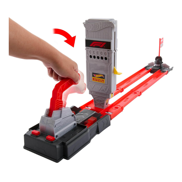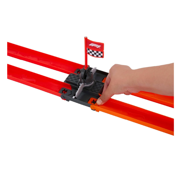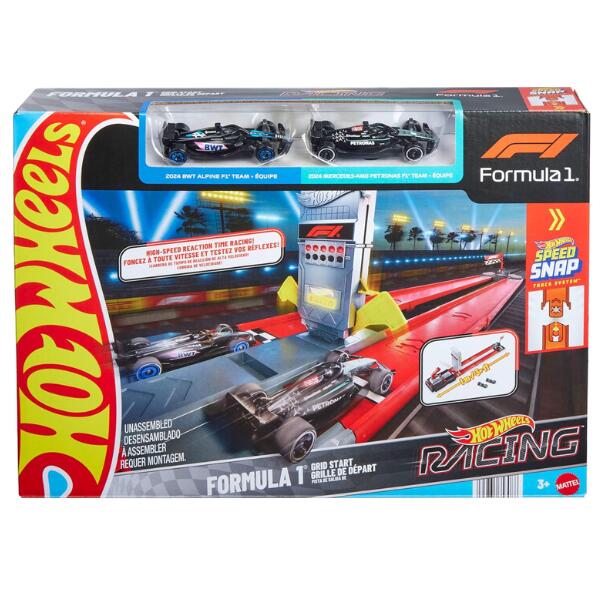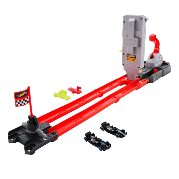 The Hot Wheels Racing Formula 1 Grid Start Track Set brings the thrilling excitement of F1 racing home with side-by-side tracks and realistic details modeled on real-life Grand Prix races! Load two officially licensed F1 cars into the launcher, push up the lever on the start tower and focus on the countdown hit the launch button and race to the end where a checkered flag declares a winner. The set features Speed Snap Track System components so kids can connect more tracks and sets to continue racing. Additional tracks sold separately. Teams, colors and decorations may vary.
