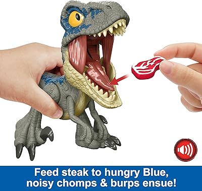 • Roar, chomp, burp! This Mega Roar edition of dinosaur Blue brings Jurassic World raptor sounds to life, with fierce roaring, snack-induced chomping and even loud burps!