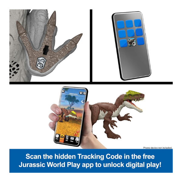 Scan the hidden Tracking Code in the free Jurassic World Play app with a compatible Android or iOS device to unlock AR experiences and fiercely fun games. In the updated app game Ride N Rampage: Colossal Chase, unlock a digital version of the dinosaur and play the fiercely fun game to race various vehicles on land, air and sea. Please note that colours and decorations may vary.