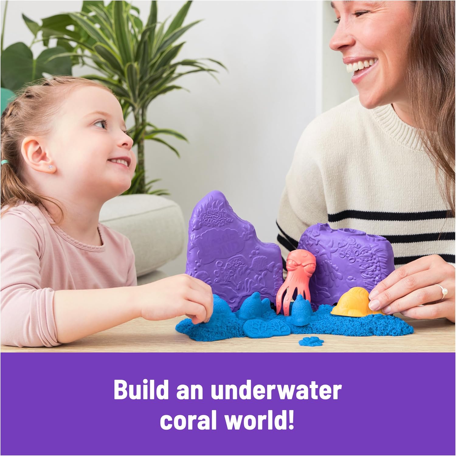 Rake & flow 8oz blue Kinetic Sand with an octopus tool & fish mold. Stamp coral textures in the colored sand with the multipurpose coral container For easy storage & cleanup, pack everything back up & play again