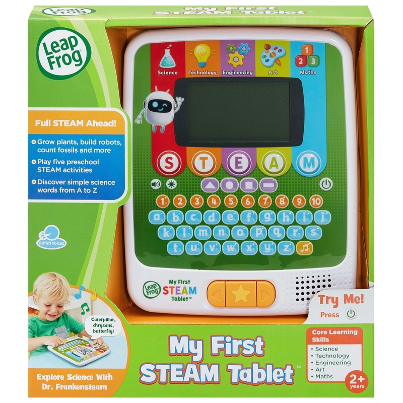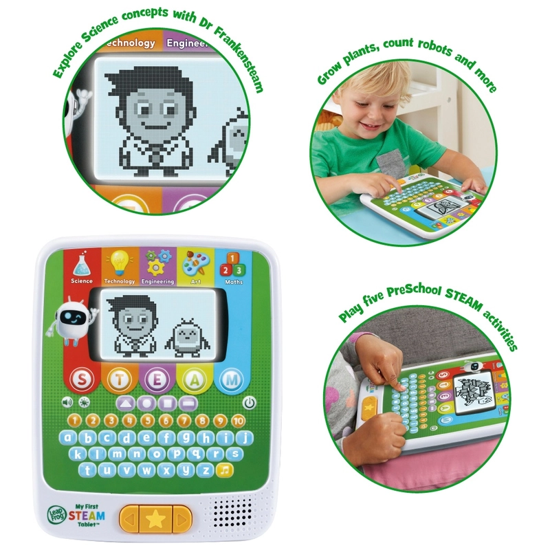 Introducing the LeapFrog My First Steam Tablet. Embark on a STEAM adventure with the LeapFrog My First STEAM Tablet. Designed for young explorers to dive into the world of Science, Technology, Engineering, Art, and Math. This interactive tablet engages curious minds with scientific activities that encourage hands-on learning.