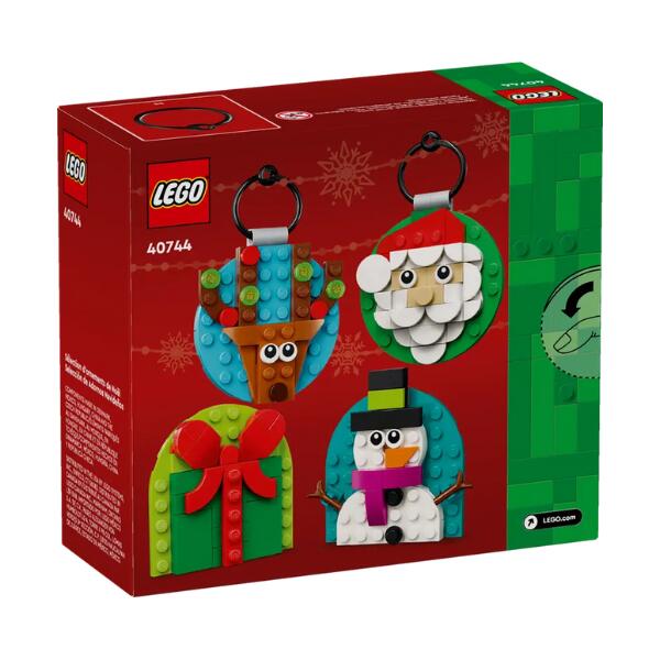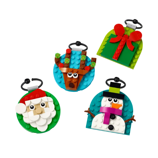 LEGO® Christmas decor – Create 4 colourful Christmas tree decorations: a present tree ornament, a Santa tree ornament, a snowman tree ornament and a reindeer tree ornament