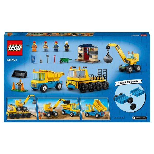Introducing Lego City 60391 Construction Trucks and Wrecking Ball Crane. Kids learn as they build and play with the LEGO® City Construction Trucks and Wrecking Ball Crane (60391) playset. Specially designed for kids aged 4+, this toy building set comes with 3 construction vehicles, a derelict house with knockdown functionality, 3 worker minifigures and fun accessories for imaginative play.