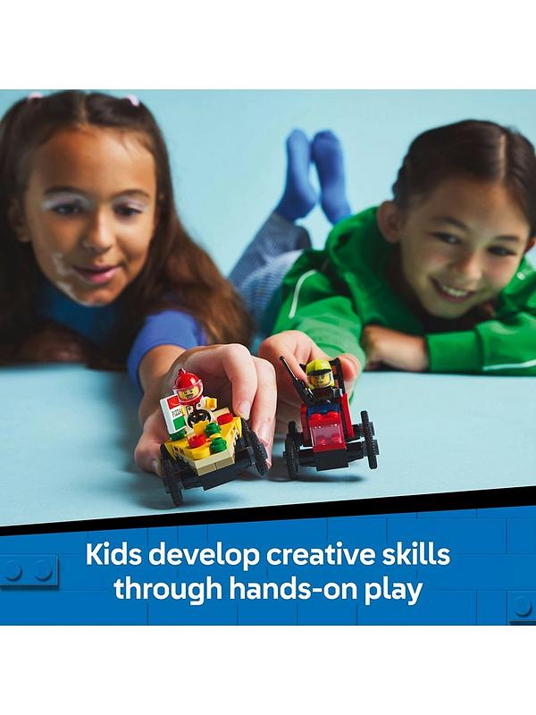 Treat your race fan to the LEGO® City Pizza vs. Fire Truck Race Car Pack (60458) for kids aged 5 and over. This fun racing set features 2 soapbox race cars and 2 minifigures. Kids can pit the chef in the sizzling pizza slice against the firefighter in the red-hot fire truck. Who’ll win? Take your seat for epic urban race action! This LEGO race car toy includes a step-by-step printed construction guide. Kids can also enjoy a fun building adventure with the LEGO Builder app, where they can zoom in, rotate the models in 3D, track their progress as they build, and explore and save other playsets. LEGO City playsets feature cool vehicles, realistic structures and fun characters that inspire play without limits. Kids can add this soapbox car set to others (sold separately) from the LEGO City range to expand their world of play possibilities.